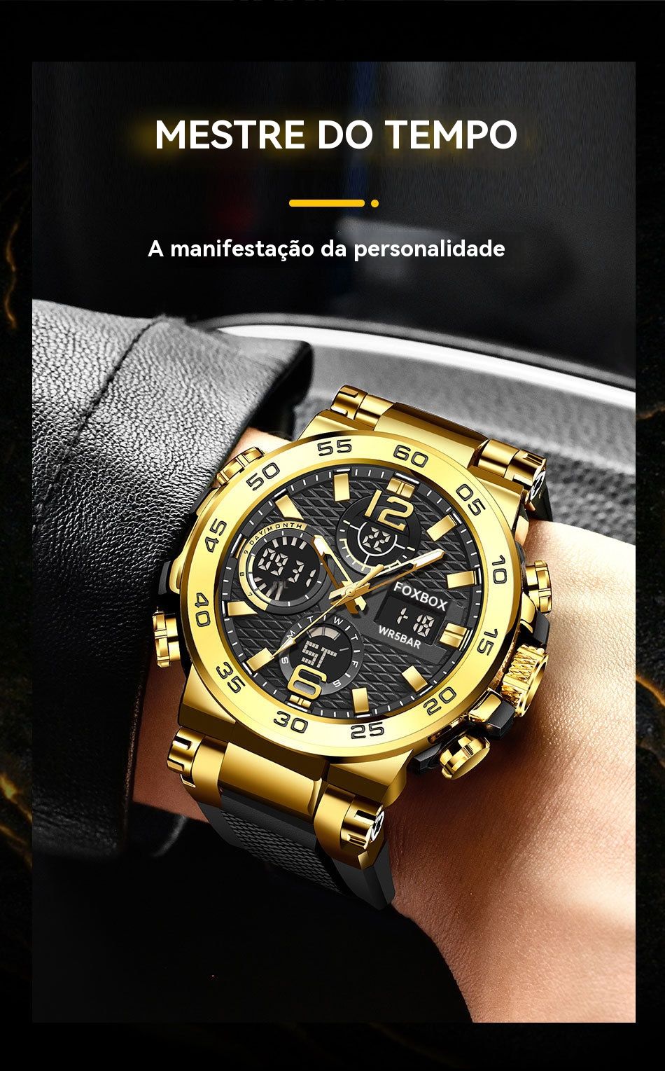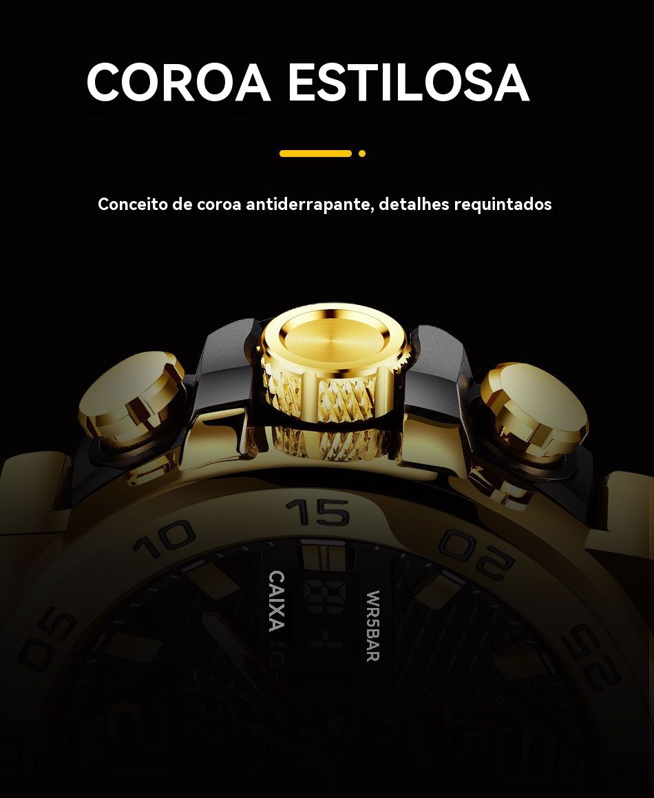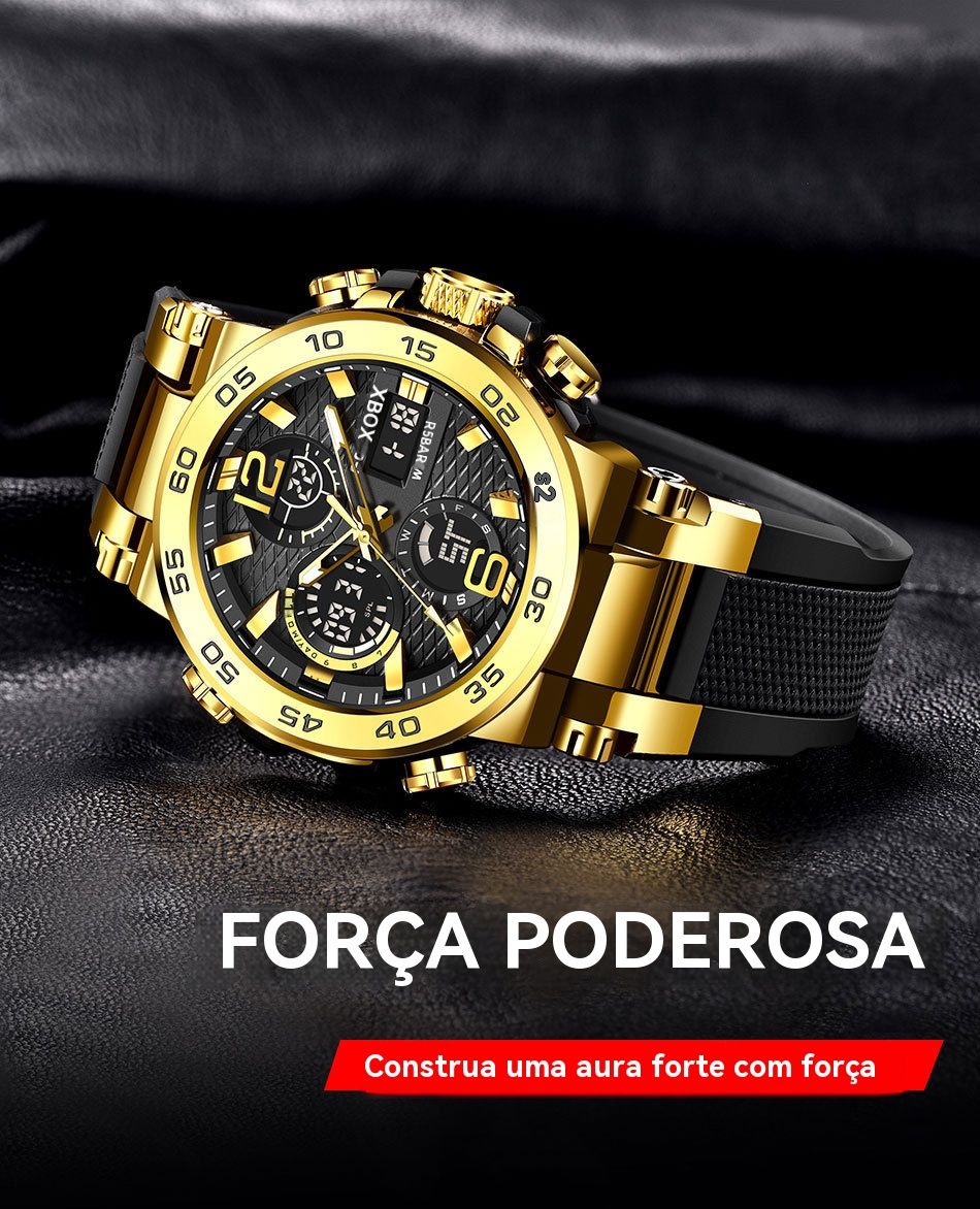 - Estilo desportivo e casual: Combina o design clássico de ouro e preto, com caixa de metal e pulseira de borracha macia. Perfeito para usar no ginásio, no trabalho ou em passeios com amigos.