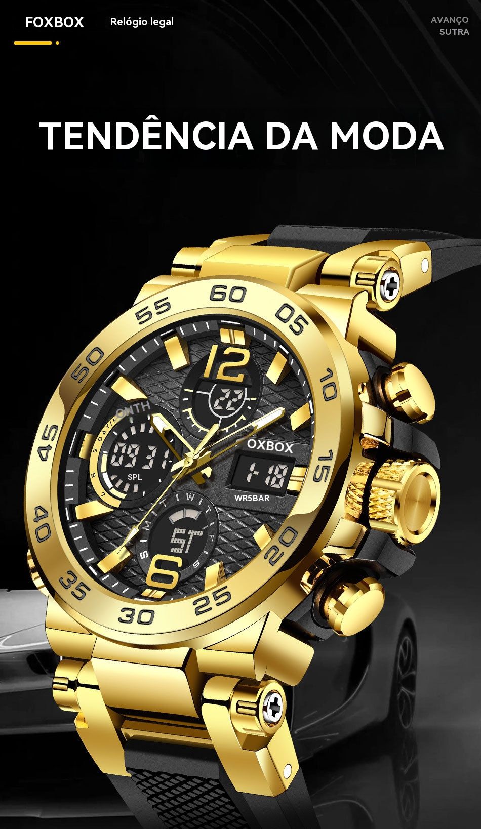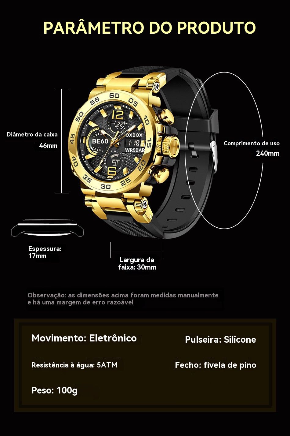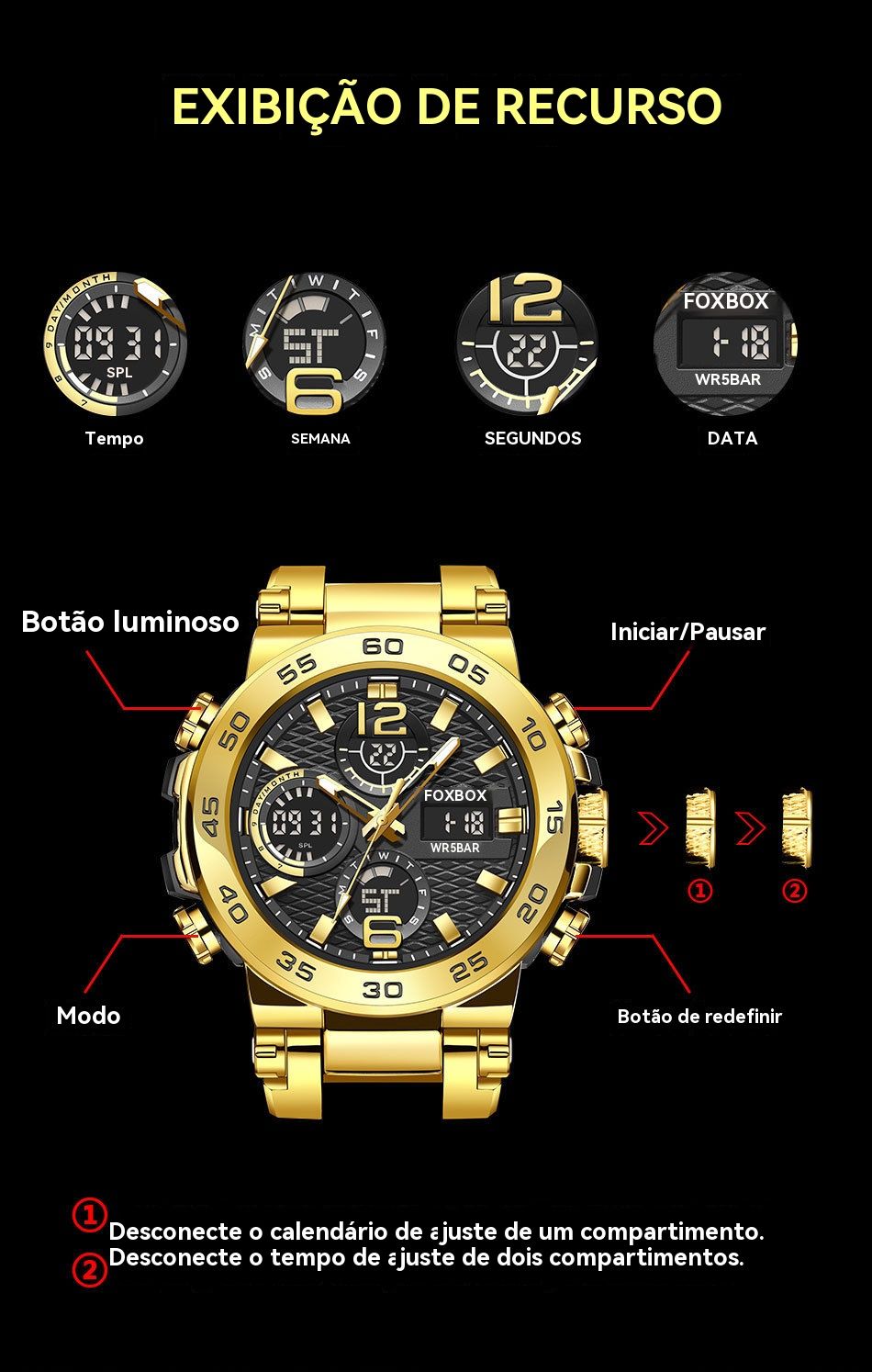 - Estilo desportivo e casual: Combina o design clássico de ouro e preto, com caixa de metal e pulseira de borracha macia. Perfeito para usar no ginásio, no trabalho ou em passeios com amigos.