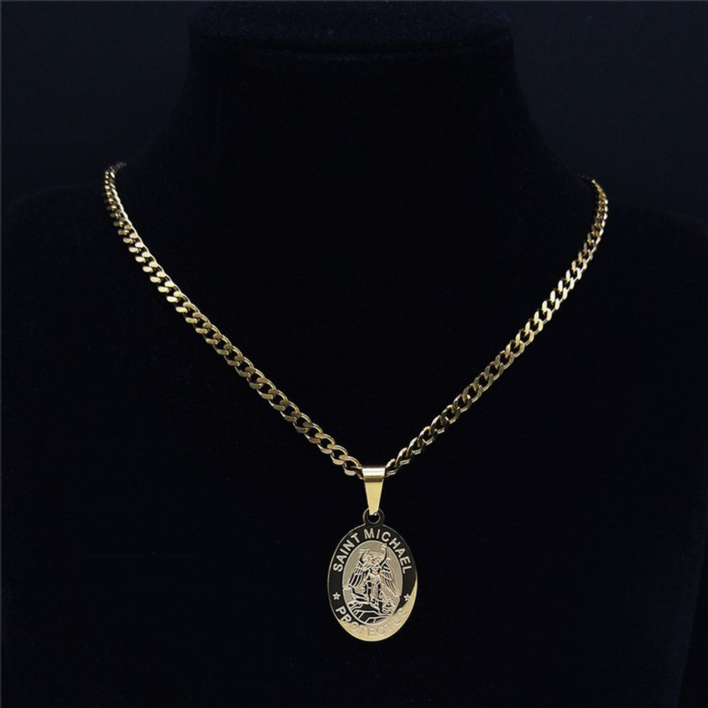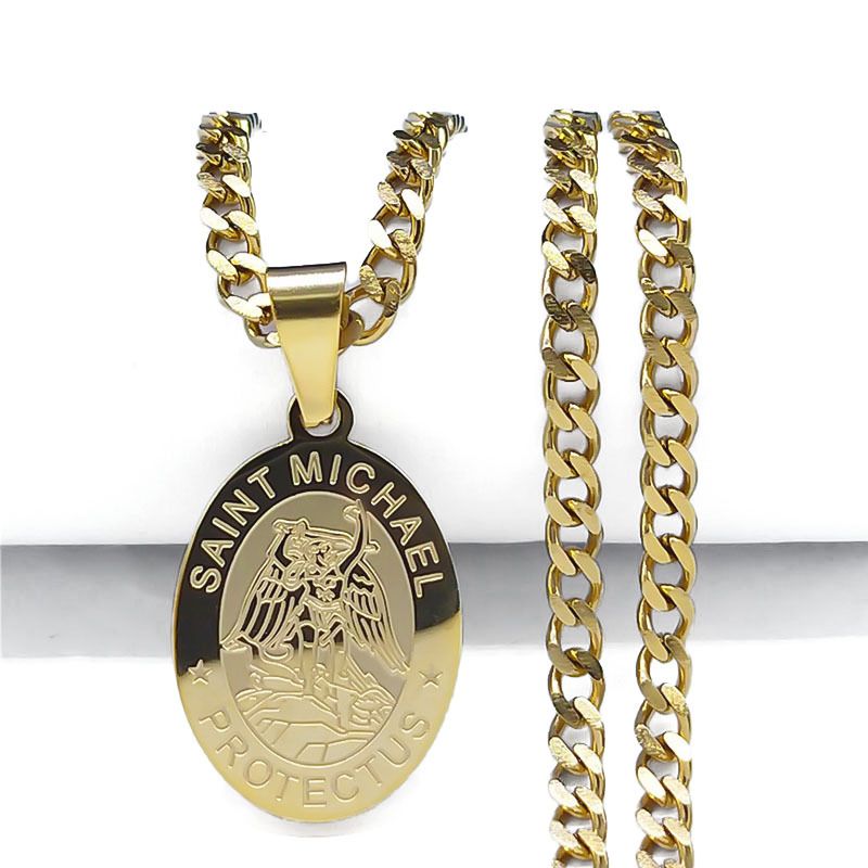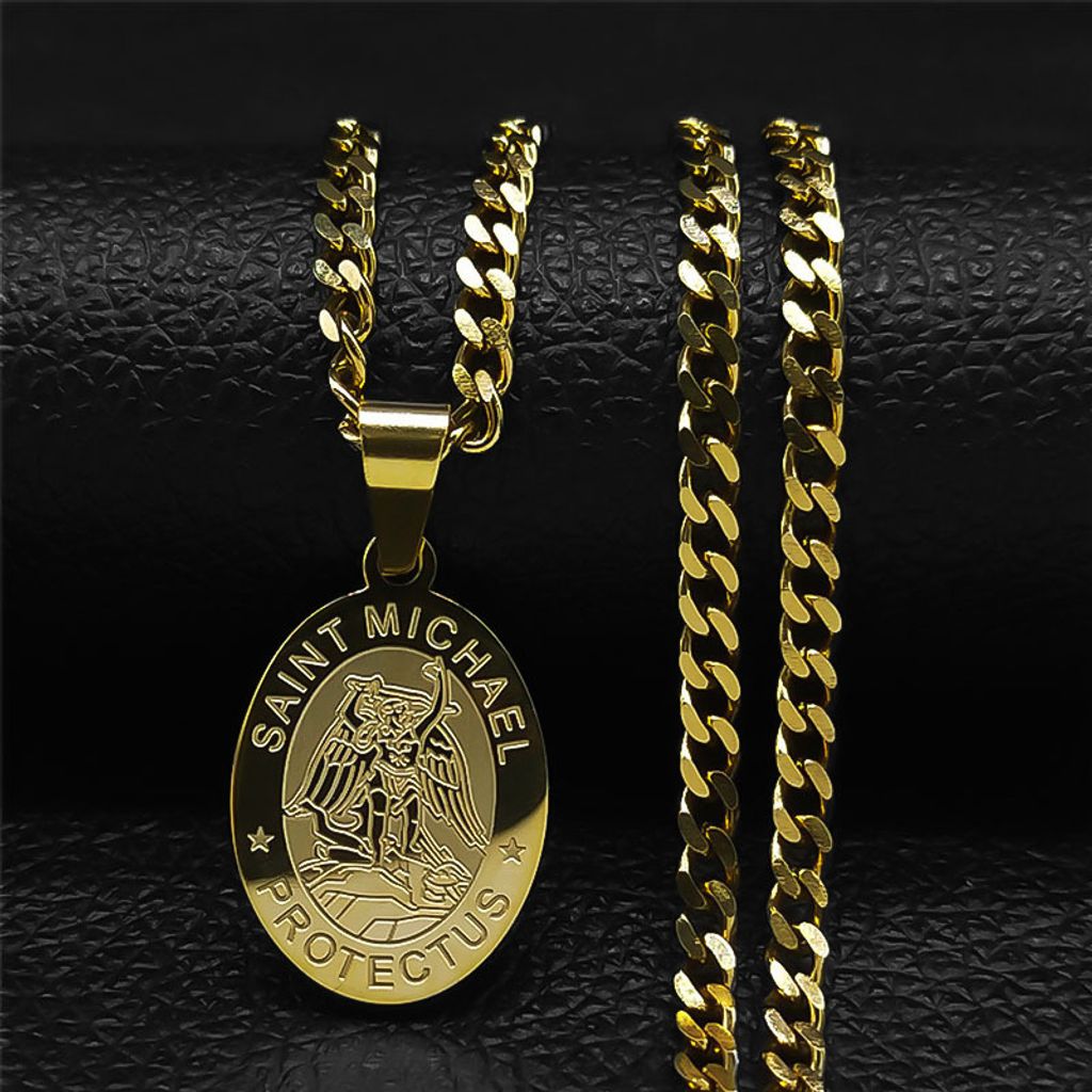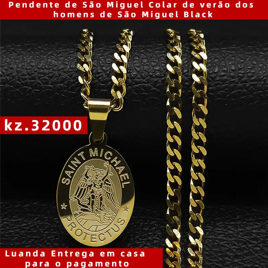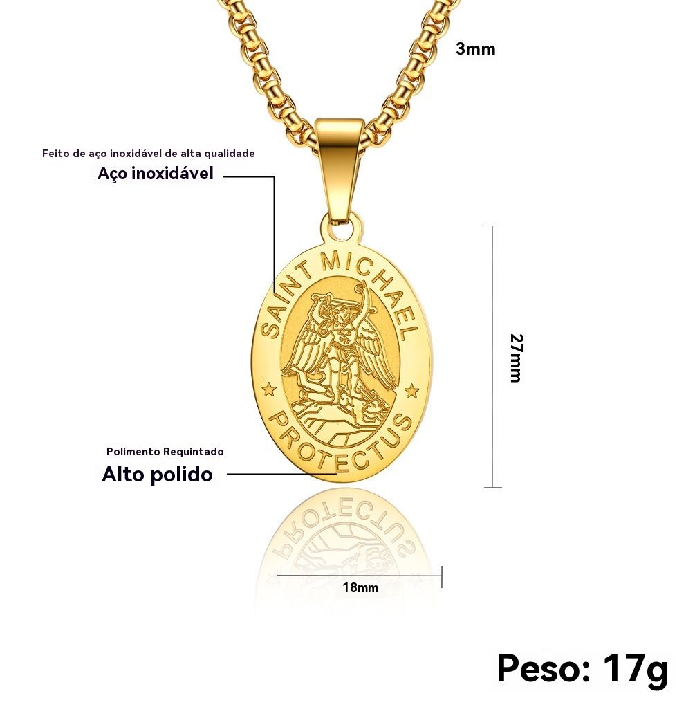 Colar de verão para homens, feito com material resistente e acabamento em ouro brilhante.O pendente oval tem a imagem de São Miguel Arcanjo, gravado com a frase “SAINT MICHAEL PROTECTUS” — uma peça que combina estilo, proteção e fé.